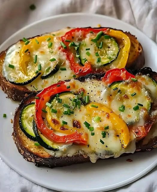 Crispy toast topped with roasted vegetables, melted cheese, and herbs – a healthy and satisfying treat!